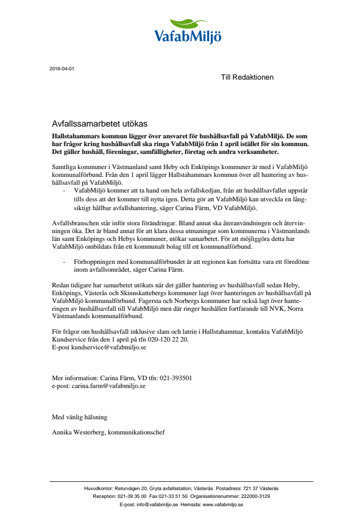 Hallstahammars kommun lägger över ansvaret för hushållsavfall på VafabMiljö. De som har frågor kring hushållsavfall ska ringa VafabMiljö från 1 april istället för sin kommun. Det gäller hushåll, föreningar, samfälligheter, företag och andra verksamheter. Vid frågor om hushållsavfall inklusive slam och latrin i Hallstahammar, kontakta VafabMiljö Kundservice från den 1 april på tfn 020-120 22 20.