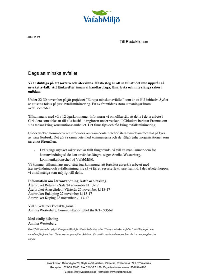 Under 22-30 november pågår projektet ”Europa minskar avfallet” som är ett EU-initiativ. Syftet är att sätta fokus på just avfallsminimering. Vi informerar om detta i Cirkulera som delas ut till alla hushåll. Under veckan informerar vi om våra containrar för återanvändbara föremål på fyra av våra återbruk. Det görs i samarbete med kommunerna och de välgörenhetsorganisationer som tar emot föremålen.