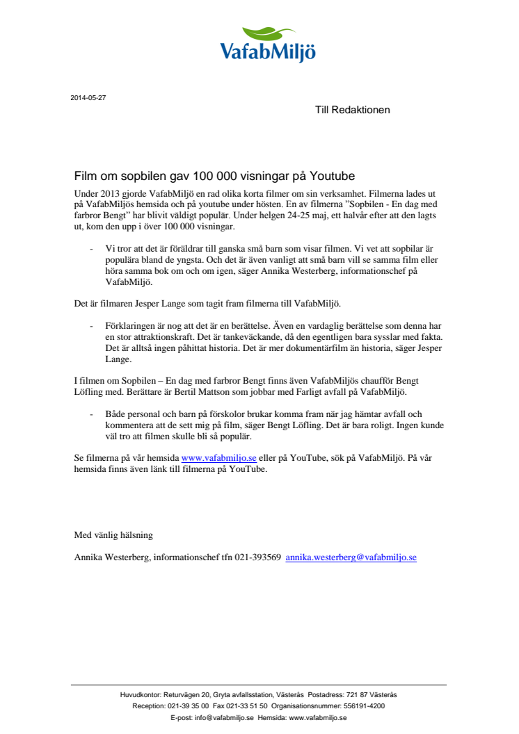 Under 2013 gjorde VafabMiljö en rad olika korta filmer om sin verksamhet. Filmerna lades ut på VafabMiljös hemsida och på youtube under hösten. En av filmerna ”Sopbilen - En dag med farbror Bengt” har blivit väldigt populär. Under helgen 24-25 maj, ett halvår efter att den lagts ut, kom den upp i över 100 000 visningar. Det är filmaren Jesper Lange som tagit fram filmerna till VafabMiljö.