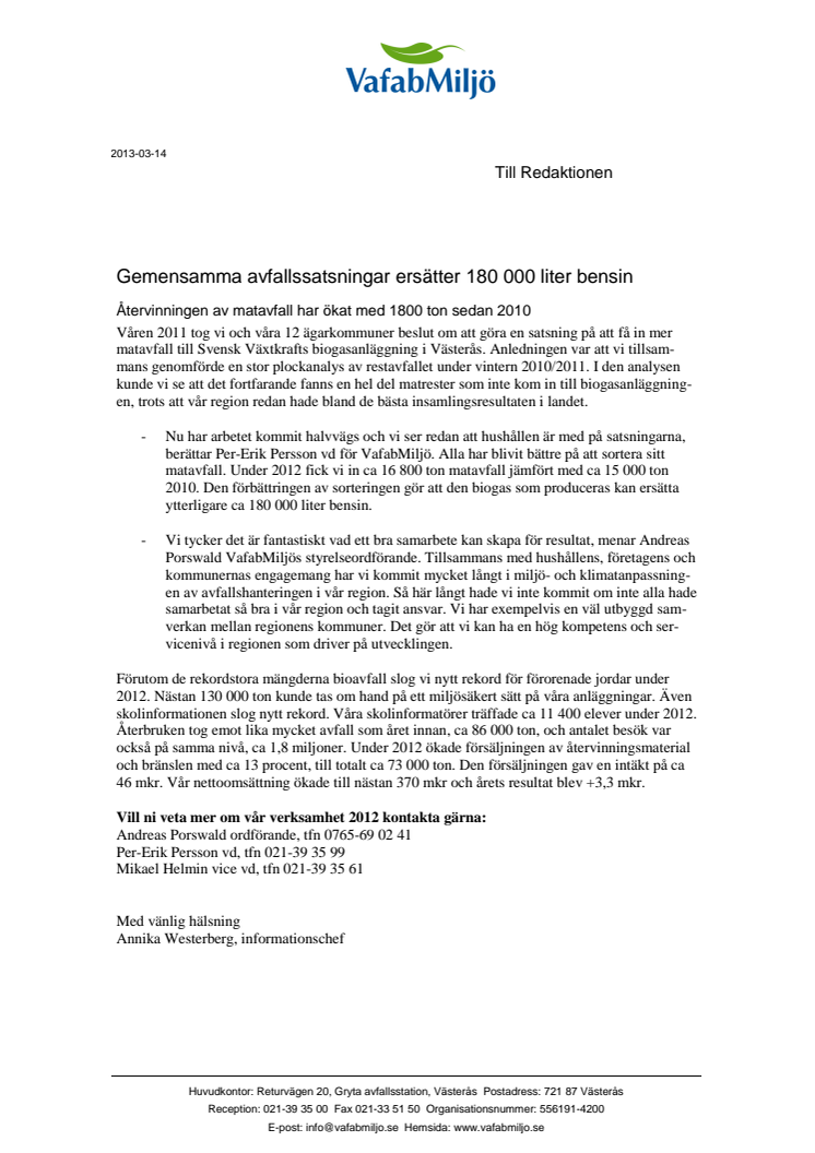 Återvinningen av matavfall har ökat med 1800 ton sedan 2010. Förutom de rekordstora mängderna bioavfall slog vi nytt rekord för förorenade jordar under 2012. Nästan 130 000 ton kunde tas om hand på ett miljösäkert sätt. Återbruken tog emot ca 86 000 ton avfall och antalet besök var ca 1,8 miljoner. Försäljningen av återvinningsmaterial och bränslen med ca 13 procent, till totalt ca 73 000 ton.
