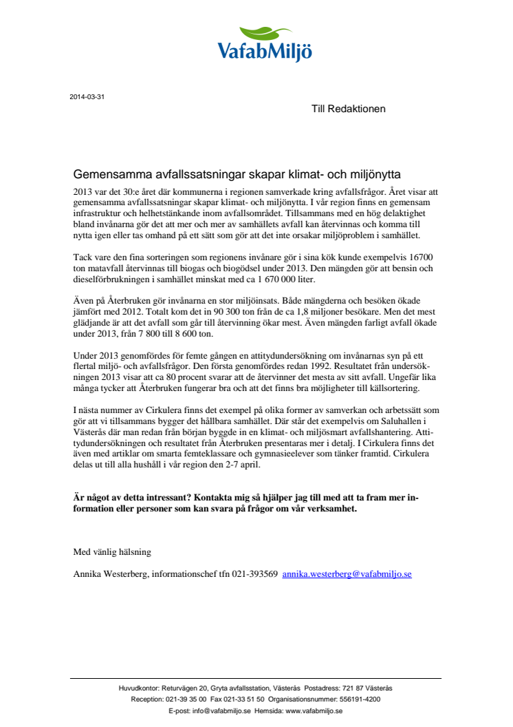 2013 var det 30:e året där kommunerna i regionen samverkade kring avfallsfrågor. Gemensamma avfallssatsningar skapar klimat- och miljönytta. Hög delaktighet bland invånarna gör att mer och mer av samhällets avfall kan återvinnas och komma till nytta igen eller tas omhand på ett sätt som gör att det inte orsakar miljöproblem. En attitydundersökning visar att 80 procent sorterar sitt avfall.