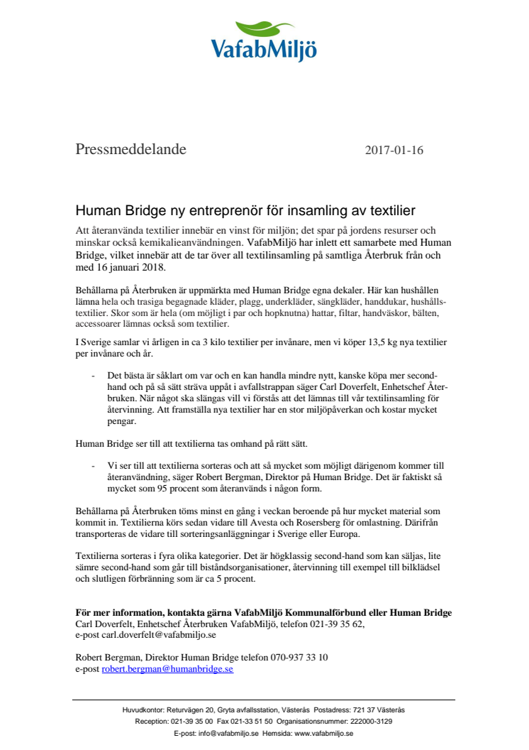 Att återanvända textilier innebär en vinst för miljön och spar på jordens resurser som vatten och energi och det minskar också kemikalieanvändningen. VafabMiljö har efter upphandling inlett ett samarbete med Human Bridge, vilket innebär att de tar över all textilinsamling på samtliga Återbruk från och med 16 januari 2018.