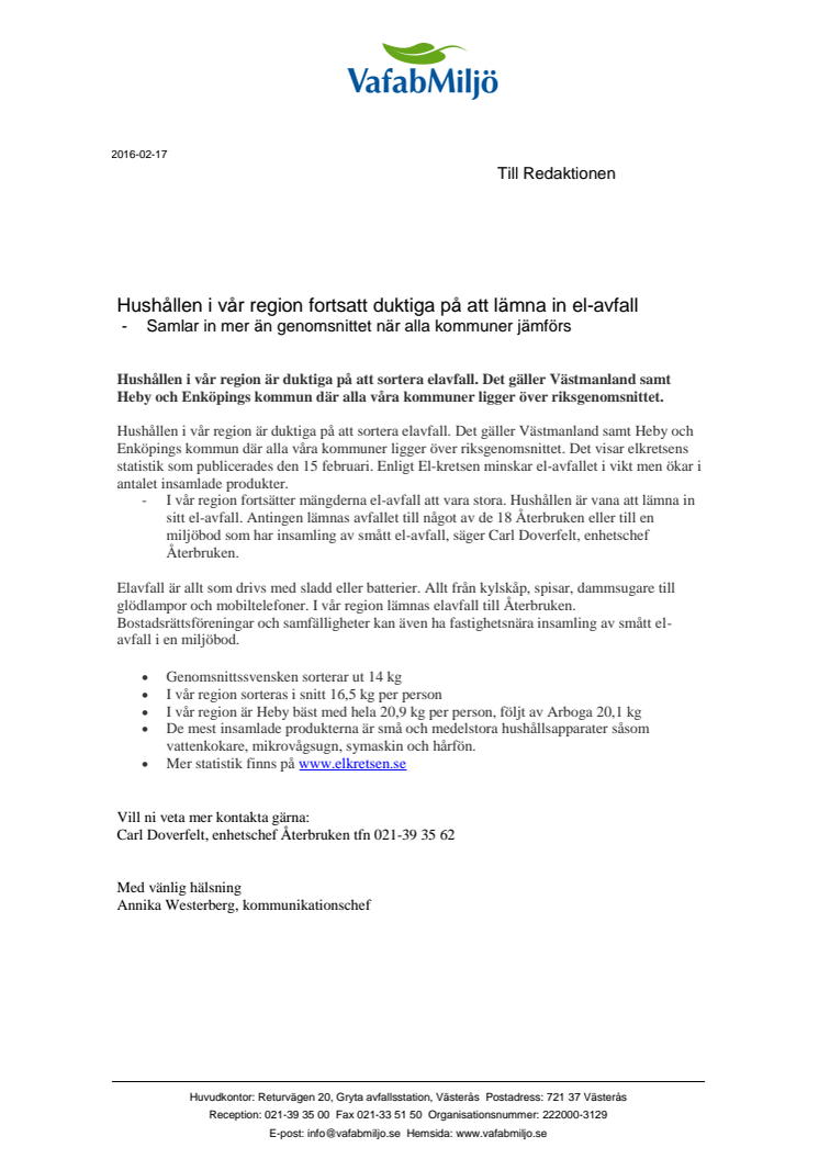 Hushållen i vår region är duktiga på att sortera elavfall. Det gäller Västmanland samt Heby och Enköpings kommun där alla kommuner ligger över riksgenomsnittet. Det visar elkretsens statistik som publicerades den 15 februari. Enligt El-kretsen minskar el-avfallet i vikt men ökar i antalet insamlade produkter. Genomsnittssvensken sorterar ut 14 kg. I vår region sorteras i snitt 16,5 kg per person