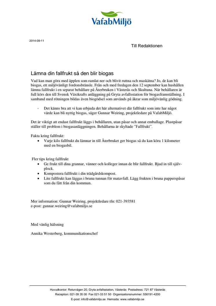 med fredagen den 12 september kan hushållen lämna fallfrukt i en separat behållare