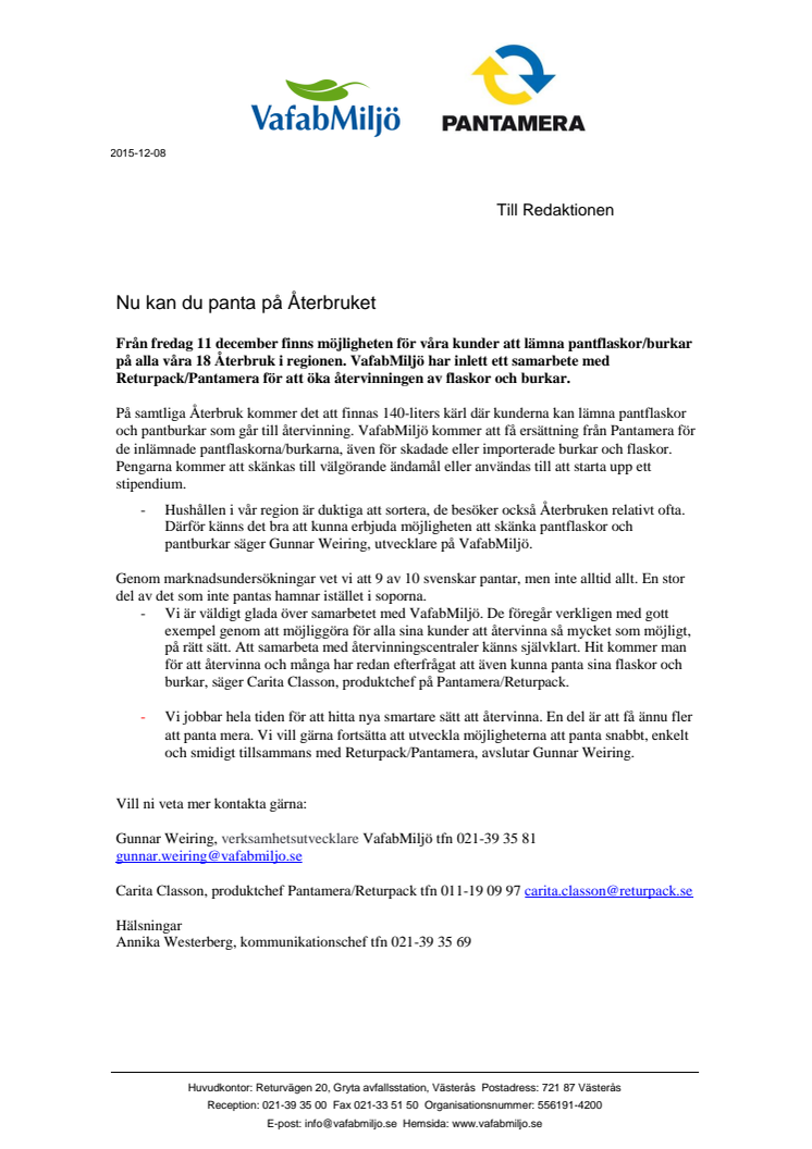 Från fredag 11 december finns möjligheten för våra kunder att lämna pantflaskor/burkar på alla våra 18 Återbruk dvs återvinningscentraler i regionen. VafabMiljö har inlett ett samarbete med Returpack/Pantamera för att öka återvinningen av flaskor och burkar. Pengarna som kommer in från panten kommer att skänkas till välgörande ändamål eller användas till att starta upp ett stipendium.