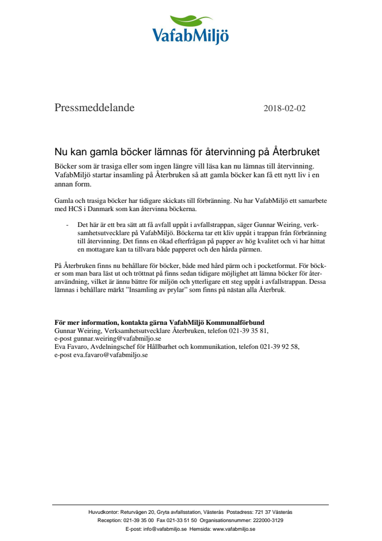 Böcker som är trasiga eller som ingen längre vill läsa kan nu lämnas till återvinning. VafabMiljö startar insamling på Återbruken så att gamla böcker kan få ett nytt liv i en annan form. På Återbruken finns nu behållare för böcker, både med hård pärm och i pocketformat. Böcker kan även lämnas för återanvändning. Dessa lämnas i behållare märkt ”Insamling av prylar” på de flesta Återbruk.