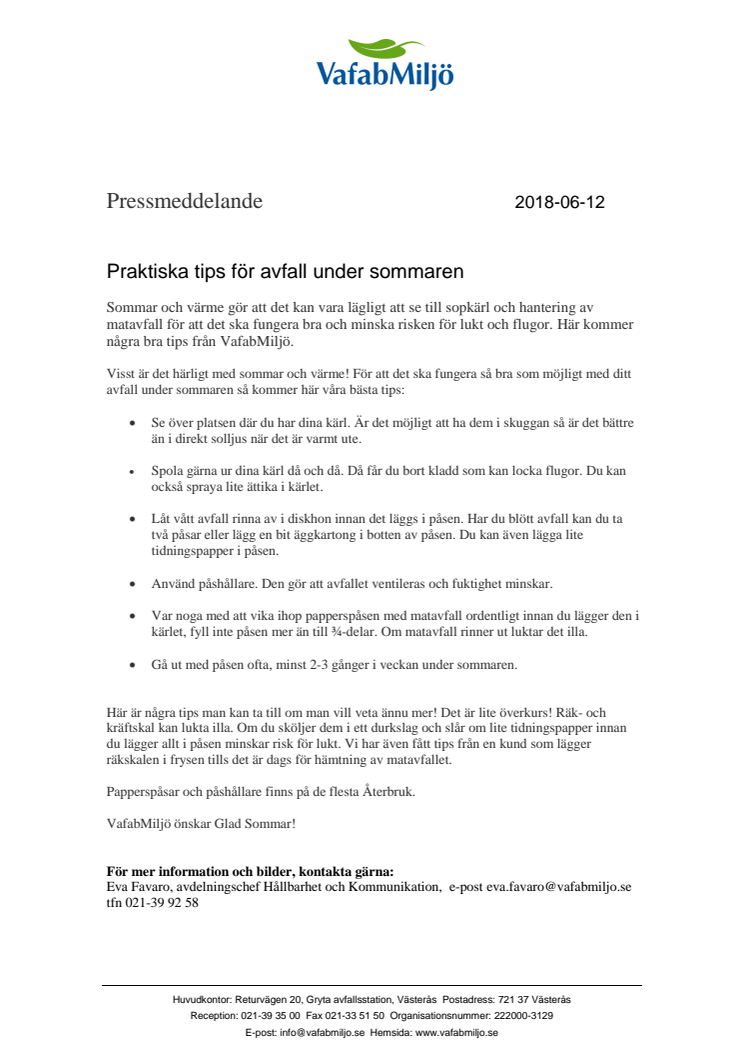 Sommar och värme gör att det kan vara lägligt att se till sopkärl och hantering av matavfall för att minska risken för lukt och flugor.