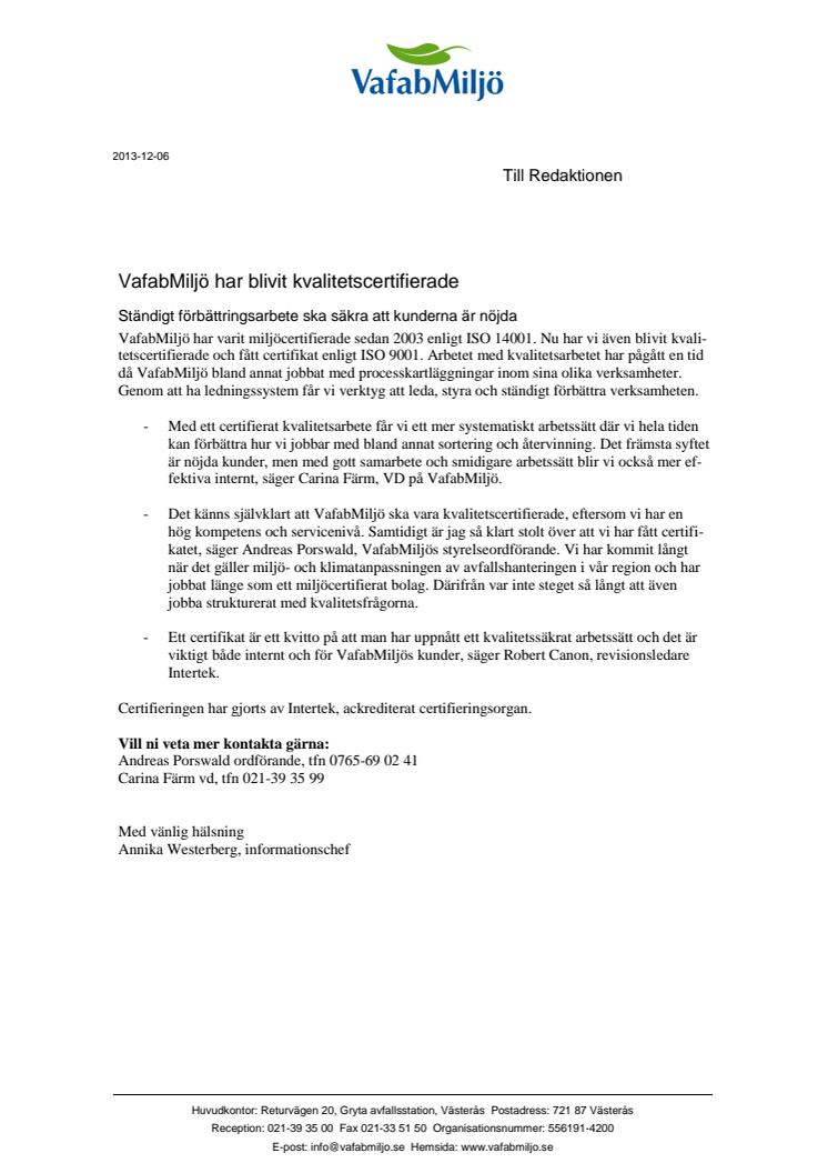 Nu har VafabMiljö blivit kvalitetscertifierade och fått certifikat enligt ISO 9001. Arbetet med kvalitetsarbetet har pågått en tid då VafabMiljö bland annat jobbat med processkartläggningar inom sina olika verksamheter. Genom att ha ledningssystem får vi verktyg att leda, styra och ständigt förbättra verksamheten.