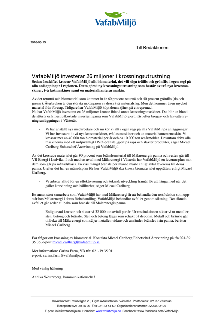 Sedan årsskiftet krossar VafabMiljö allt biomaterial, det vill säga träflis och grönflis, i egen regi på alla anläggningar i regionen. Detta görs i ny krossningsutrustning som består av två nya krossmaskiner, två lastmaskiner samt en materialhanterarmaskin. Det blir en av de mest påkostade investeringarna som VafabMiljö gjort, näst efter biogas- och lakvattenreningsanläggningen i Västerås.
