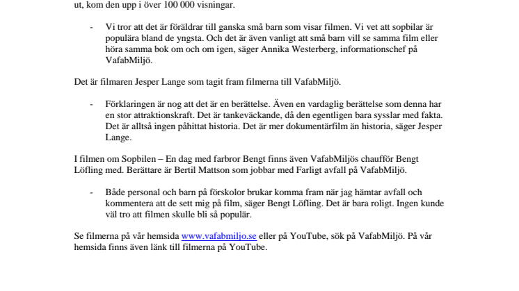 Under 2013 gjorde VafabMiljö en rad olika korta filmer om sin verksamhet. Filmerna lades ut på VafabMiljös hemsida och på youtube under hösten. En av filmerna ”Sopbilen - En dag med farbror Bengt” har blivit väldigt populär. Under helgen 24-25 maj, ett halvår efter att den lagts ut, kom den upp i över 100 000 visningar.