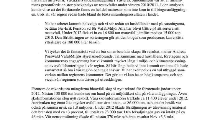 - Nu har arbetet kommit halvvägs och vi ser redan att hushållen är med på satsningarna, berättar Per-Erik Persson vd för VafabMiljö. Alla har blivit bättre på att sortera sitt matavfall. Under 2012 fick vi in ca 16 800 ton matavfall jämfört med ca 15 000 ton 2010. Den förbättringen av sorteringen gör att den biogas som produceras kan ersätta ytterligare ca 180 000 liter bensin.