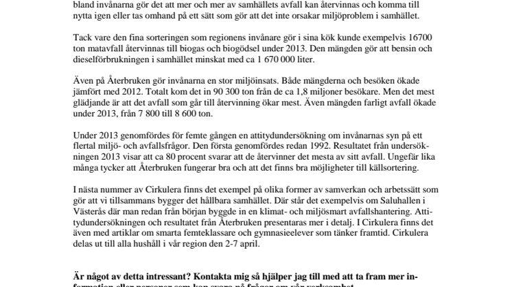 I nästa nummer av Cirkulera finns det exempel på olika former av samverkan och arbetssätt som gör att vi tillsammans bygger det hållbara samhället. Där står det exempelvis om Saluhallen i Västerås där man redan från början byggde in en klimat- och miljösmart avfallshantering. Attitydundersökningen och resultatet från Återbruken presentaras mer i detalj. I Cirkulera finns det även med artiklar om smarta femteklassare och gymnasieelever som tänker framtid. Cirkulera delas ut till alla hushåll i vår region den 2-7 april.