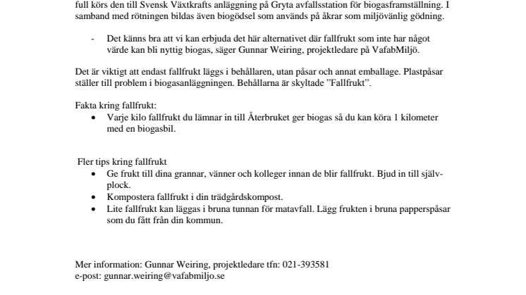 - Varje kilo fallfrukt du lämnar in till Återbruket ger biogas så du kan köra 1 kilometer med en biogasbil.