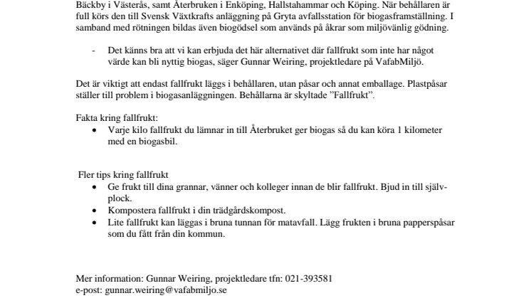 Vad kan man göra med äpplen som ramlat ner och blivit ruttna och maskätna? Jo, de kan bli biogas, ett miljövänligt fordonsbränsle. Från och med fredagen den 28 augusti kan hushållen lämna fallfrukt i en separat behållare på Återbruket Gryta, Hälla, Stenby, Ängsgärdet och Bäckby i Västerås, samt Återbruken i Enköping, Hallstahammar och Köping. När behållaren är full körs den till Svensk Växtkrafts anläggning på Gryta avfallsstation för biogasframställning. I samband med rötningen bildas även biogödsel som används på åkrar som miljövänlig gödning.