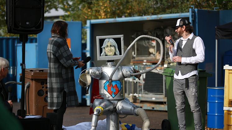 Solen sprack fram mellan molnen när Vafabmiljö nyinvigde det nyrenoverade återbruket i Skinnskatteberg den 2 oktober. Bland besökarna fanns allt från förskolepedagoger och återbruksbesökare till politiker och tjänstemän i kommunen. Under invigningen täckte vi av ett konstverk av rockikonen Mikkey Dee, trummis i The Scorpions, skapat i återbrukat material.