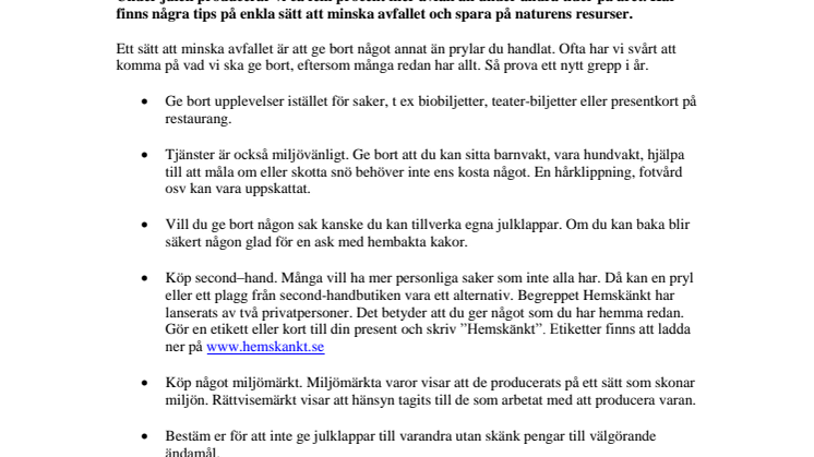· Köp second–hand. Många vill ha mer personliga saker som inte alla har. Då kan en pryl eller ett plagg från second-handbutiken vara ett alternativ. Begreppet Hemskänkt har lanserats av två privatpersoner. Det betyder att du ger något som du har hemma redan. Gör en etikett eller kort till din present och skriv ”Hemskänkt”. Etiketter finns att ladda ner på www.hemskankt.se