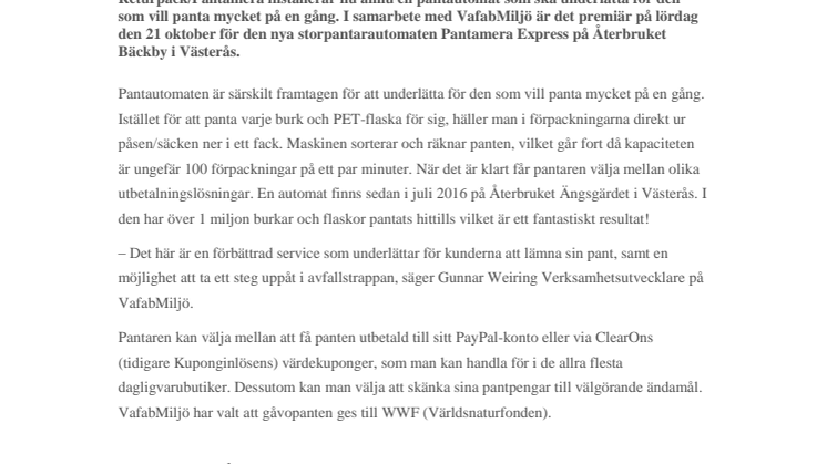 Returpack/Pantamera installerar nu ännu en pantautomat som ska underlätta för den som vill panta mycket på en gång. I samarbete med VafabMiljö är det premiär på lördag den 21 oktober för den nya storpantarautomaten Pantamera Express på Återbruket Bäckby i Västerås.