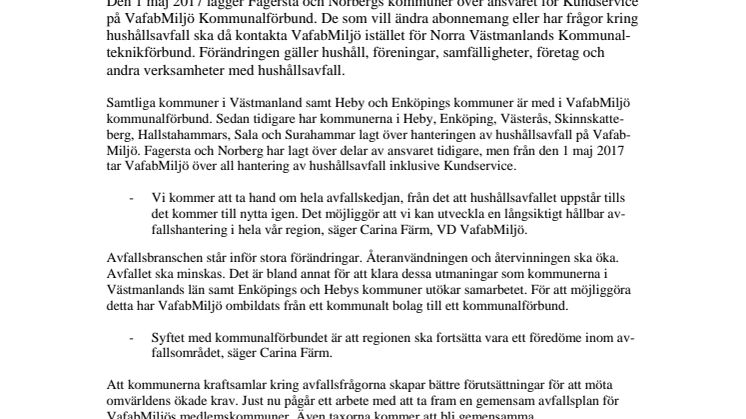 Samtliga kommuner i Västmanland samt Heby och Enköpings kommuner är med i VafabMiljö kommunalförbund. Sedan tidigare har kommunerna i Heby, Enköping, Västerås, Skinnskatteberg, Hallstahammars, Sala och Surahammar lagt över hanteringen av hushållsavfall på VafabMiljö. Fagersta och Norberg har lagt över delar av ansvaret tidigare, men från den 1 maj 2017 tar VafabMiljö över all hantering av hushållsavfall inklusive Kundservice.
