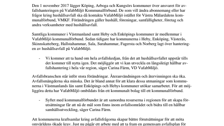 Den 1 november 2017 lägger Köping, Arboga och Kungsörs kommuner över ansvaret för avfallshanteringen på VafabMiljö Kommunalförbund. De som vill ändra abonnemang eller har frågor kring hushållsavfall ska då kontakta VafabMiljö istället för Västra Mälardalens kommunalförbund, VMKF. Förändringen gäller hushåll, föreningar, samfälligheter, företag och andra verksamheter med hushållsavfall.