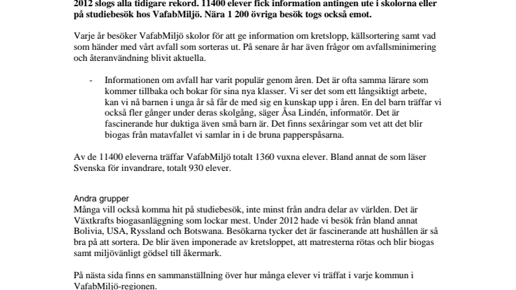 VafabMiljö har informerat skolelever om avfall och miljöfrågor sedan 80-talet. Under 2012 slogs alla tidigare rekord. 11400 elever fick information antingen ute i skolorna eller på studiebesök hos VafabMiljö. Nära 1 200 övriga besök togs också emot.