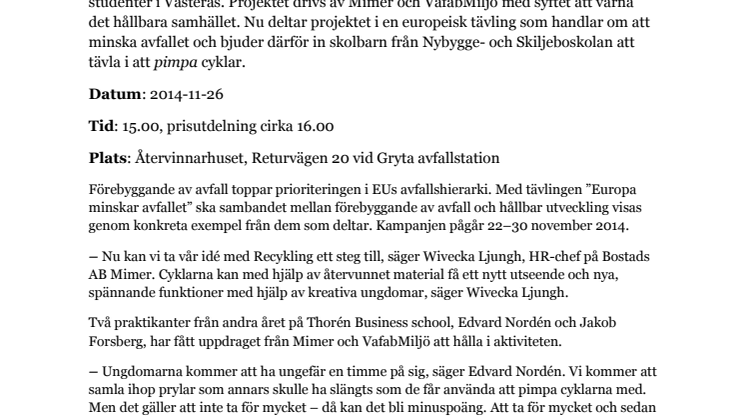 I projektet Recykling renoveras gamla cyklar och hyrs ut, främst till utländska studenter i Västerås. Projektet drivs av Mimer och VafabMiljö med syftet att värna det hållbara samhället. Nu deltar projektet i en europeisk tävling som handlar om att minska avfallet och bjuder därför in skolbarn från Nybygge- och Skiljeboskolan att tävla i att pimpa cyklar.