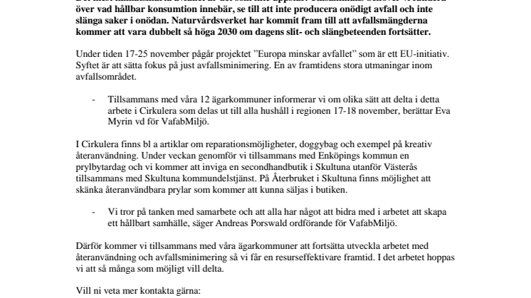 - Tillsammans med våra 12 ägarkommuner informerar vi om olika sätt att delta i detta arbete i Cirkulera som delas ut till alla hushåll i regionen 17-18 november, berättar Eva Myrin vd för VafabMiljö.
