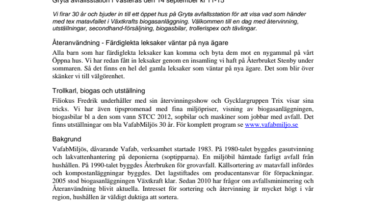 Vi firar 30 år och bjuder in till ett öppet hus på Gryta avfallsstation den 14 september för att visa vad som händer med tex matavfallet i Växtkrafts biogasanläggning. Välkommen till en dag med återvinning, utställningar, secondhand-försäljning, biogasbilar, trollerispex och tävlingar.