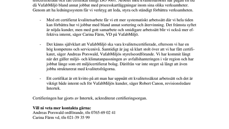 kvalitetssäkrat arbetssätt och det är viktigt både internt och för VafabMiljös kunder,