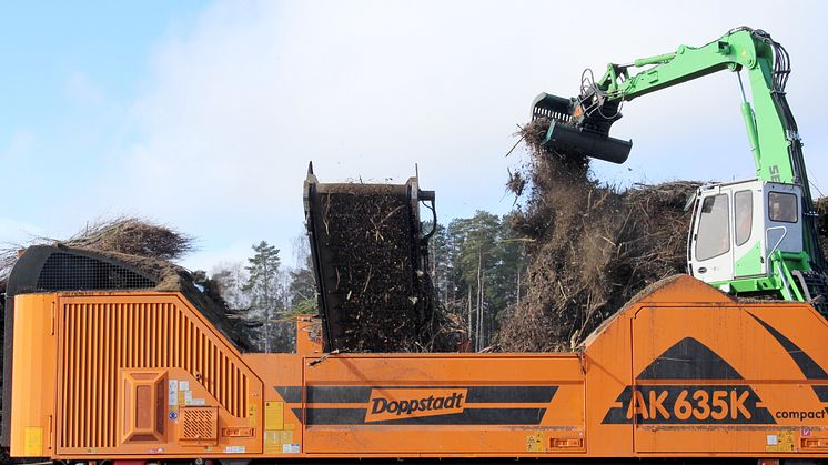 Sedan årsskiftet krossar VafabMiljö allt biomaterial, det vill säga träflis och grönflis, i egen regi på alla anläggningar i regionen. Detta görs i ny krossningsutrustning som består av två nya krossmaskiner, två lastmaskiner samt en materialhanterarmaskin.