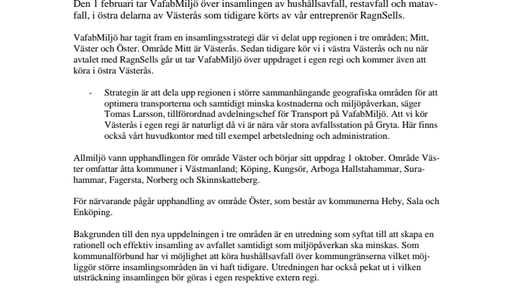 För mer information, kontakta gärna VafabMiljö Kommunalförbund Tomas Larsson, Tillförordnad avdelningschef Transport, telefon 021-39 35 60,