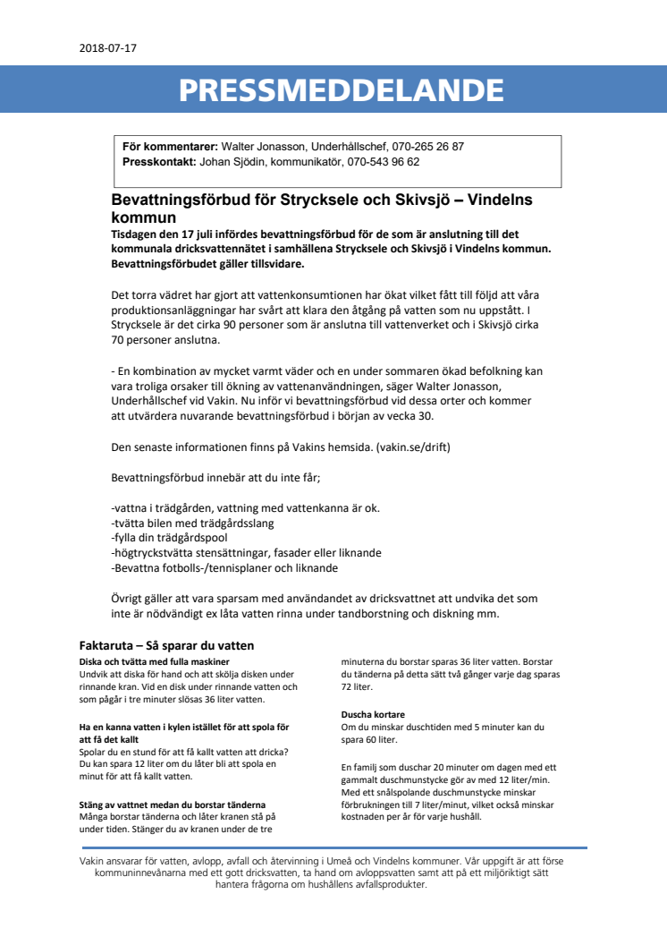Tisdagen den 17 juli infördes bevattningsförbud för de som är anslutning till det kommunala dricksvattennätet i samhällena Strycksele och Skivsjö i Vindelns kommun. Bevattningsförbudet gäller tillsvidare.
