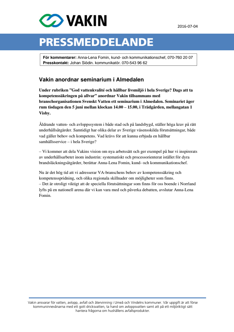 Under rubriken ”God vattenkvalité och hållbar livsmiljö i hela Sverige? Dags att ta kompetenssäkringen på allvar” anordnar Vakin tillsammans med branschorganisationen Svenskt Vatten ett seminarium i Almedalen. Seminariet äger rum tisdagen den 5 juni mellan klockan 14.00 – 15.00, i Trädgården, mellangatan 1 Visby.