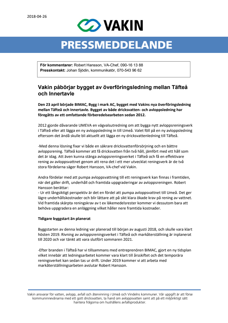 Den 23 april började bygget med Vakins nya överföringsledning mellan Täfteå och Innertavle. Bygget av både dricksvatten- och avloppsledning har föregåtts av ett omfattande förberedelsearbeten sedan 2012. Arbetet beräknas klart vid årsskiftet. Under 2019 kommer arbete med markåterställning pågå.