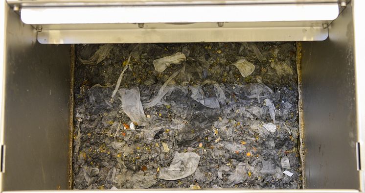 En bild som visar en del av vad som rensas i rensgaller vid Umeå avloppsreningsverk. På bilden syns bland annat våtservetter.