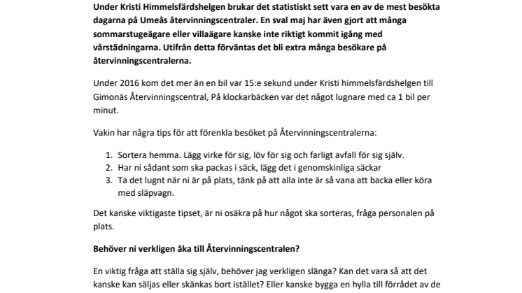 Under Kristi Himmelsfärdshelgen brukar det statistiskt sett vara en av de mest besökta dagarna på Umeås återvinningscentraler. En sval maj har även gjort att många sommarstugeägare eller villaägare kanske inte riktigt kommit igång med vårstädningarna. Utifrån detta förväntas det bli extra många besökare på återvinningscentralerna.