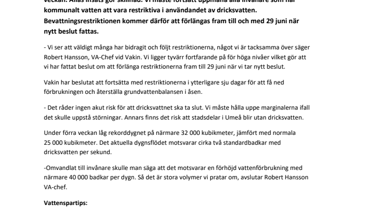 - Vi ser att väldigt många har bidragit och följt restriktionerna, något vi är tacksamma över säger Robert Hansson, VA-Chef vid Vakin. Vi ligger tyvärr fortfarande på för höga nivåer vilket gör att vi har fattat beslut om att förlänga restriktionerna fram till 29 juni när vi tar nytt beslut.
