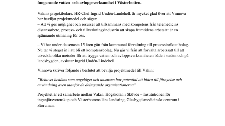 Vakin har beviljats projektpengar av Vinnova för en förstudie inom området ”Virtuell VA-Kompetens i Norr”. Totalt har förstudien beviljats 388 800 kr. Målet med studien är att undersöka tekniska och virtuella lösningar för att säkerställa en fungerande vatten- och avloppsverksamhet i Västerbotten.