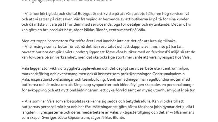 – Vi är oerhört glada och stolta! Betyget är ett kvitto på att vårt arbete håller en hög servicenivå och att vi satsar på rätt saker. Vår framgång är beroende av att butikerna är på tå för sina kunder och då måste vi vara på tå för dem med serviceanda, öga för detaljer och nytänkande. Det är då vi kan göra en bra produkt bäst, säger Niklas Blonér, centrumchef på Väla.