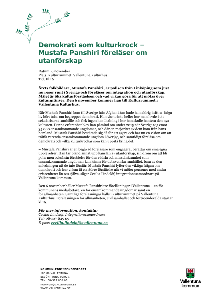 – Mustafa Panshiri är en begåvad föreläsare som engagerat berättar om sina egna upplevelser. Han tar bland annat upp känslan av utanförskap, sin dröm om att bli polis men också sin förståelse för den rädsla och misstänksamhet som ensamkommande ungdomar kan känna för det svenska samhället, bara av den anledningen att de inte förstår. Mustafa Panshiri lyfter den viktiga frågan om demokrati och hur vi kan få en större förståelse när vi möter personer med andra erfarenheter än oss själva, säger Cecilia Lindelöf, integrationssamordnare på Vallentuna kommun.