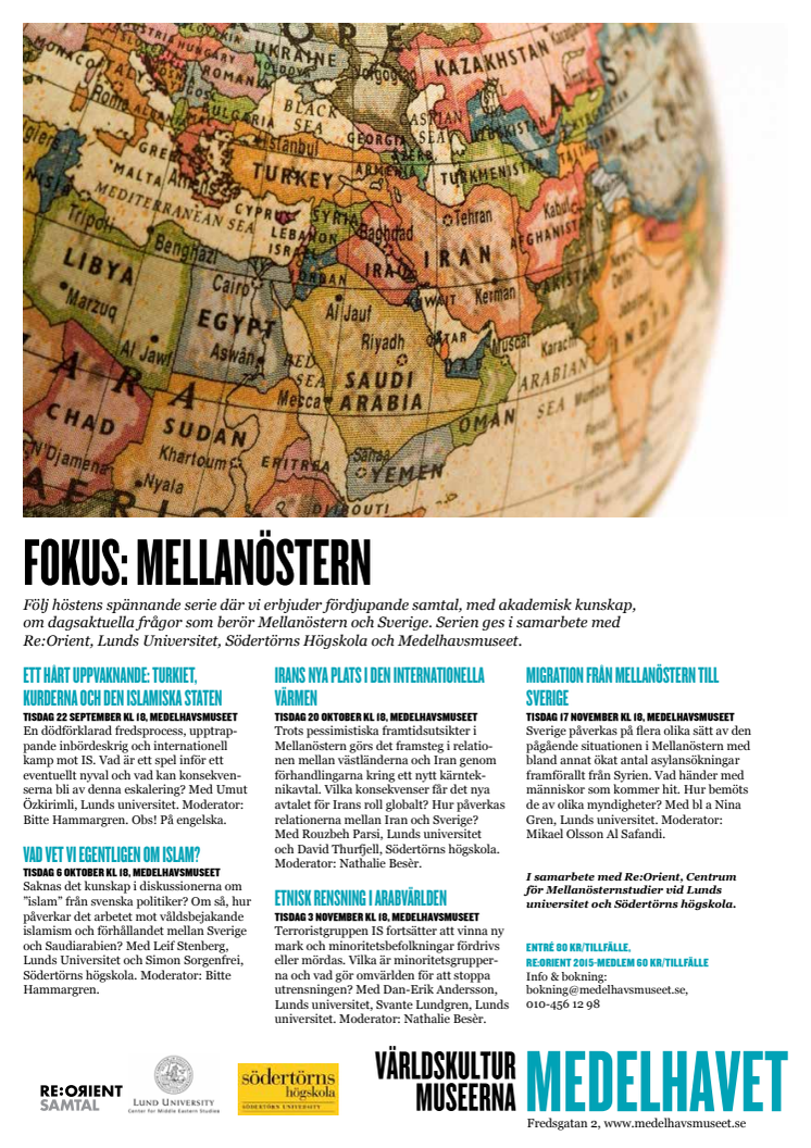 Följ höstens spännande serie, Fokus: Mellanöstern, där vi erbjuder fördjupande samtal, med akademisk kunskap, om dagsaktuella frågor som berör Mellanöstern och Sverige. Serien ges i samarbete med Re:Orient, Lunds Universitet, Södertörns Högskola och Medelhavsmuseet.