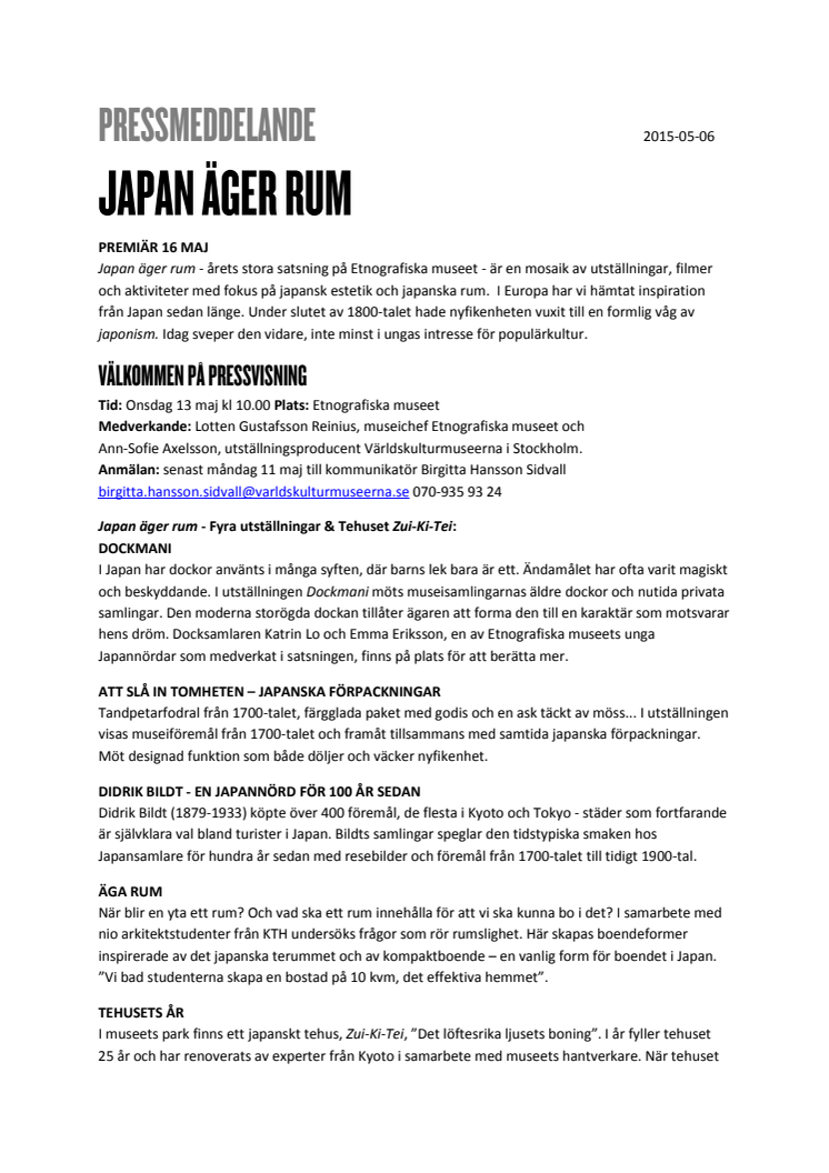 Premiär 16 maj för Japan äger rum - årets stora satsning på Etnografiska museet - är en mosaik av utställningar, filmer och aktiviteter med fokus på japansk estetik och japanska rum. I Europa har vi hämtat inspiration från Japan sedan länge. Under slutet av 1800-talet hade nyfikenheten vuxit till en formlig våg av japonism. Idag sveper den vidare, inte minst i ungas intresse för populärkultur.