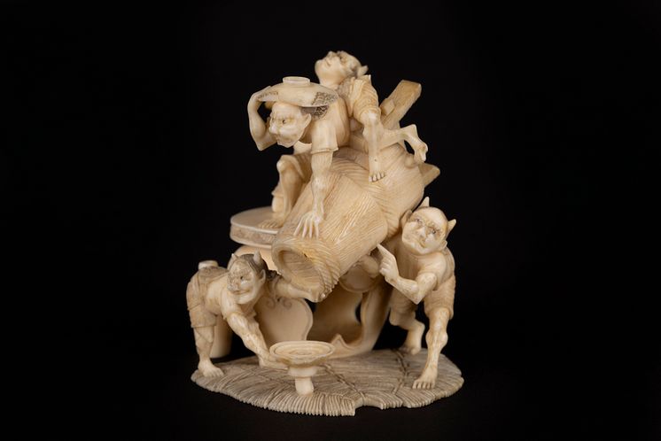 Statyett föreställande fyra oni (demoner) kring ett sake-kärl. 1800-tal. Från Världskulturmuseernas samling.