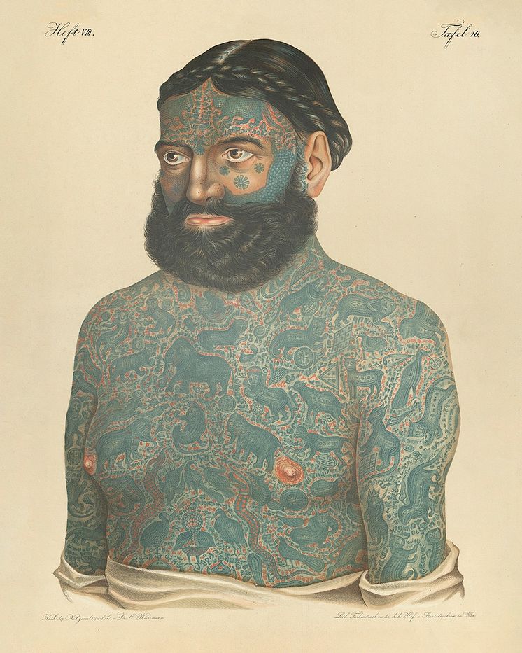 Albanske George Costentenus (född 1833), den "Tatuerade grekiske prinsen", var en berömd cirkusartist som var tatuerad över hela kroppen. Han påstod att han, under sitt äventyrliga liv, hade blivit kidnappad och tatuerad mot sin vilja. Porträtt av Carl Heitzmann. Bild med tillstånd av Hagströmerbiblioteket, Karolinska Institutet.