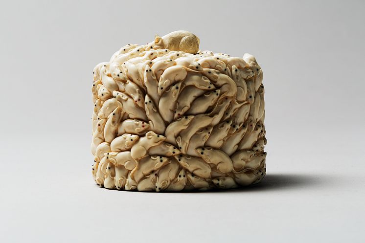 Ett litet mästerverk i elfenben, ask med handsnidade möss från Cronholms samling.