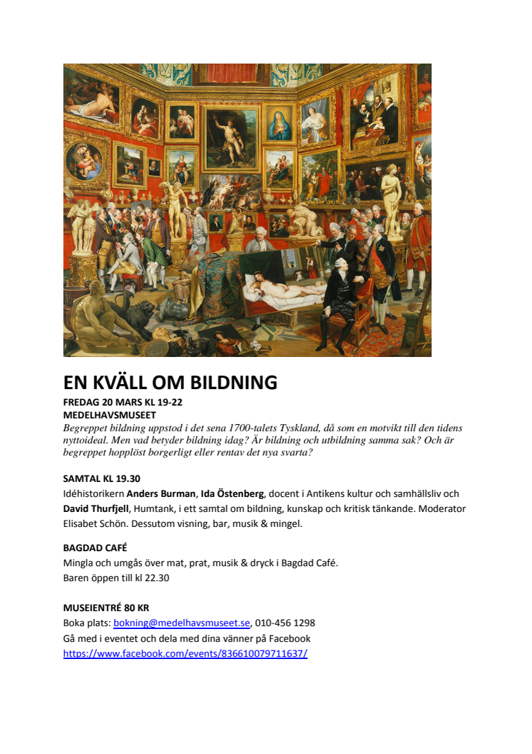 Idéhistorikern Anders Burman, Ida Östenberg, docent i Antikens kultur och samhällsliv och David Thurfjell, Humtank, i ett samtal om bildning, kunskap och kritisk tänkande. Moderator Elisabet Schön. Dessutom visning, bar, musik & mingel.