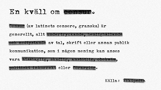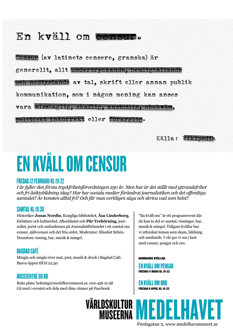 En kväll om Censur fredag 12 februari kl 19.30 på Medelhavsmuseet. I år fyller den första tryckfrihetsförordningen 250 år. Men hur är det ställt med yttrandefrihet och fri åsiktsbildning idag? Hur har sociala medier förändrat journalistiken och det offentliga samtalet? Är konsten alltid fri? Och får man verkligen säga och skriva vad som helst?