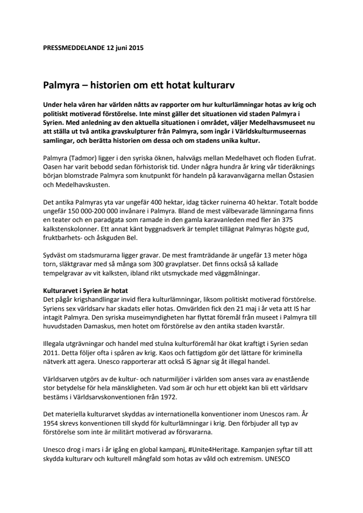 Under hela våren har världen nåtts av rapporter om hur kulturlämningar hotas av krig och politiskt motiverad förstörelse. Inte minst gäller det situationen vid staden Palmyra i Syrien. Med anledning av den aktuella situationen i området, väljer Medelhavsmuseet nu att ställa ut två antika gravskulpturer från Palmyra, som ingår i Världskulturmuseernas samlingar, och berätta historien om dessa och om stadens unika kultur.