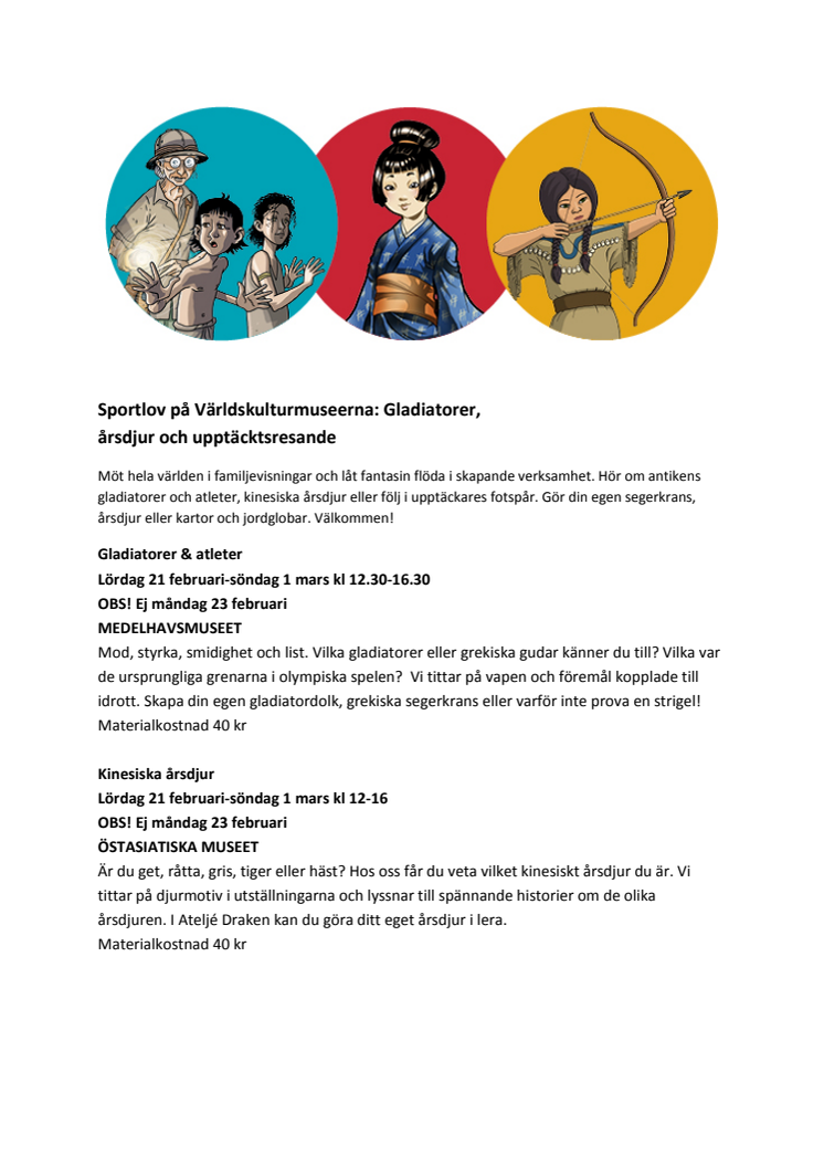 Möt hela världen i familjevisningar och låt fantasin flöda i skapande verksamhet. Hör om antikens gladiatorer och atleter, kinesiska årsdjur eller följ i upptäckares fotspår. Gör din egen segerkrans, årsdjur eller kartor och jordglobar. Välkommen!