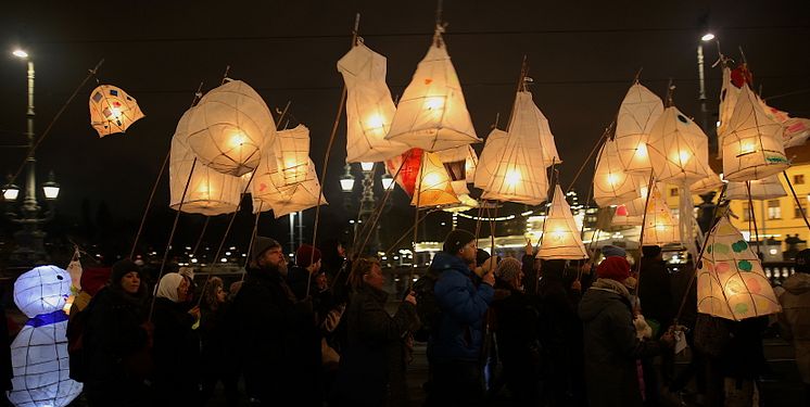 Kl 16:30: Samling vid Världskulturmuseet, lyktorna tänds på Götaplatsen vid kl 17.30