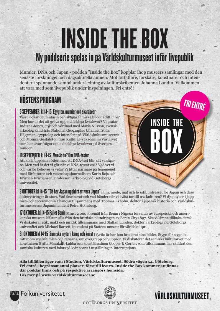 Tillsammans med Folkuniversitetet och Centrum för kritiska kulturarvsstudier vid Göteborgs universitet lanserar Världskulturmuseerna en helt ny poddserie som spelas in inför livepublik på Världskulturmuseet i Göteborg. Första programmet av Inside the Box körs den 5 september och handlar om mumier och hanteringen av mänskliga kvarlevor.